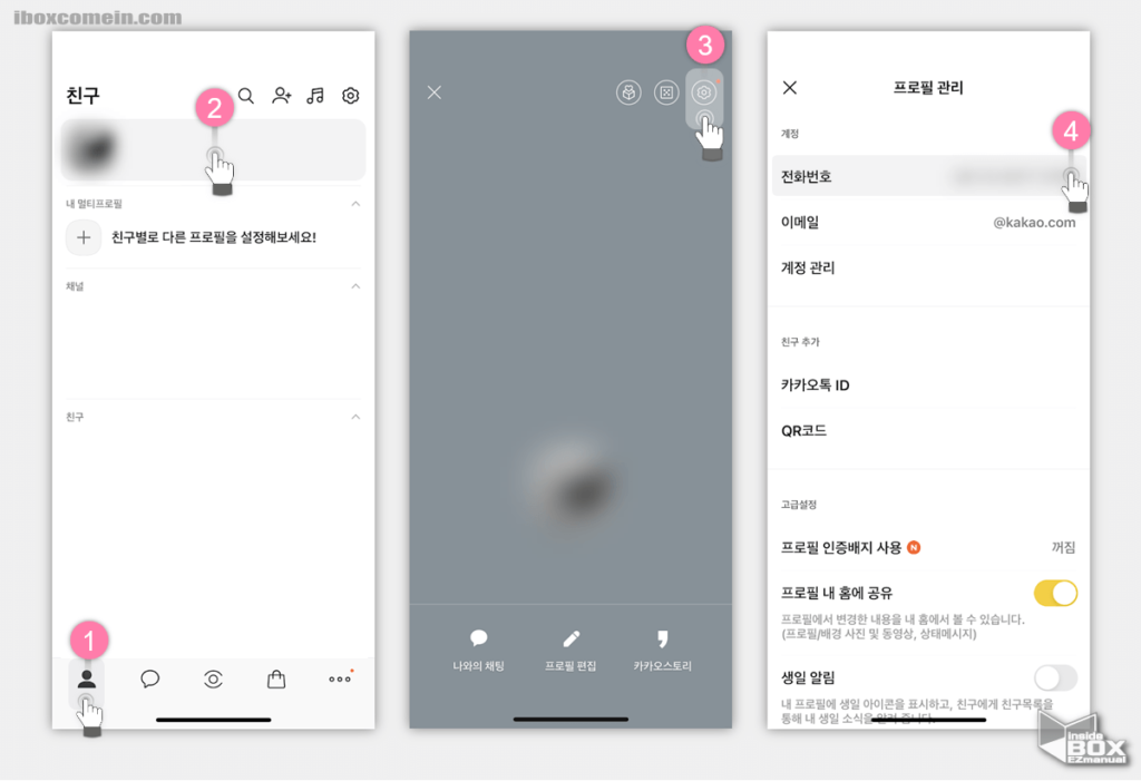 전체 설정을 클릭하면 카카오 계정을 비롯해 개인/보안, 친구, 알림, 화면, 테마 등 다양한 메뉴가 나오는데 여기서 오른쪽 상단 프로필 관리를 클릭한다. 프로필 관리를 클릭하면 전화번호나 이메일 등 프로필에 대한 정보를 확인할 수 있으며, 여기서는 전화번호를 클릭한다.