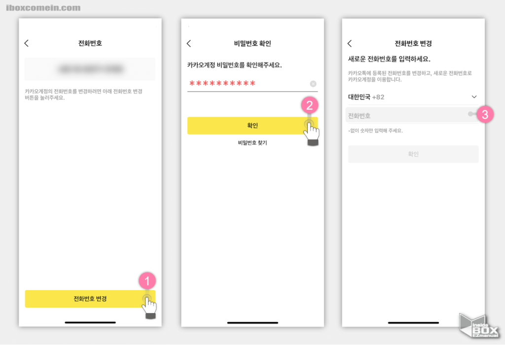 전화번호를 클릭하면 현재 인증된 번호를 확인할 수 있으며 화면 하단에서는 전화번호 변경 아이콘이 있음을 확인할 수 있다. 전화번호 변경 아이콘을 클릭하면 카카오 계정 비밀번호 확인 절차를 진행하게 되며 비밀번호 확인 절차가 완료되면 새 전화번호를 입력하는 창이 뜬다.