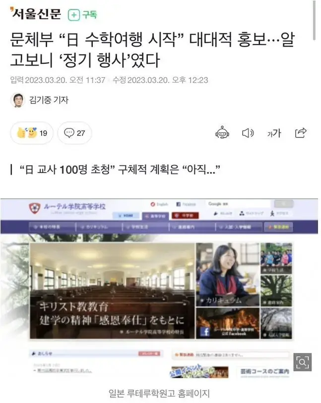 하지만 이를 장려한 고교는 조금 의아하다. 이번 수학여행은 일본 루테루학원고와 한국 전주의 신흥고 여학생회 관계로 정기적인 행사로 진행됐다.